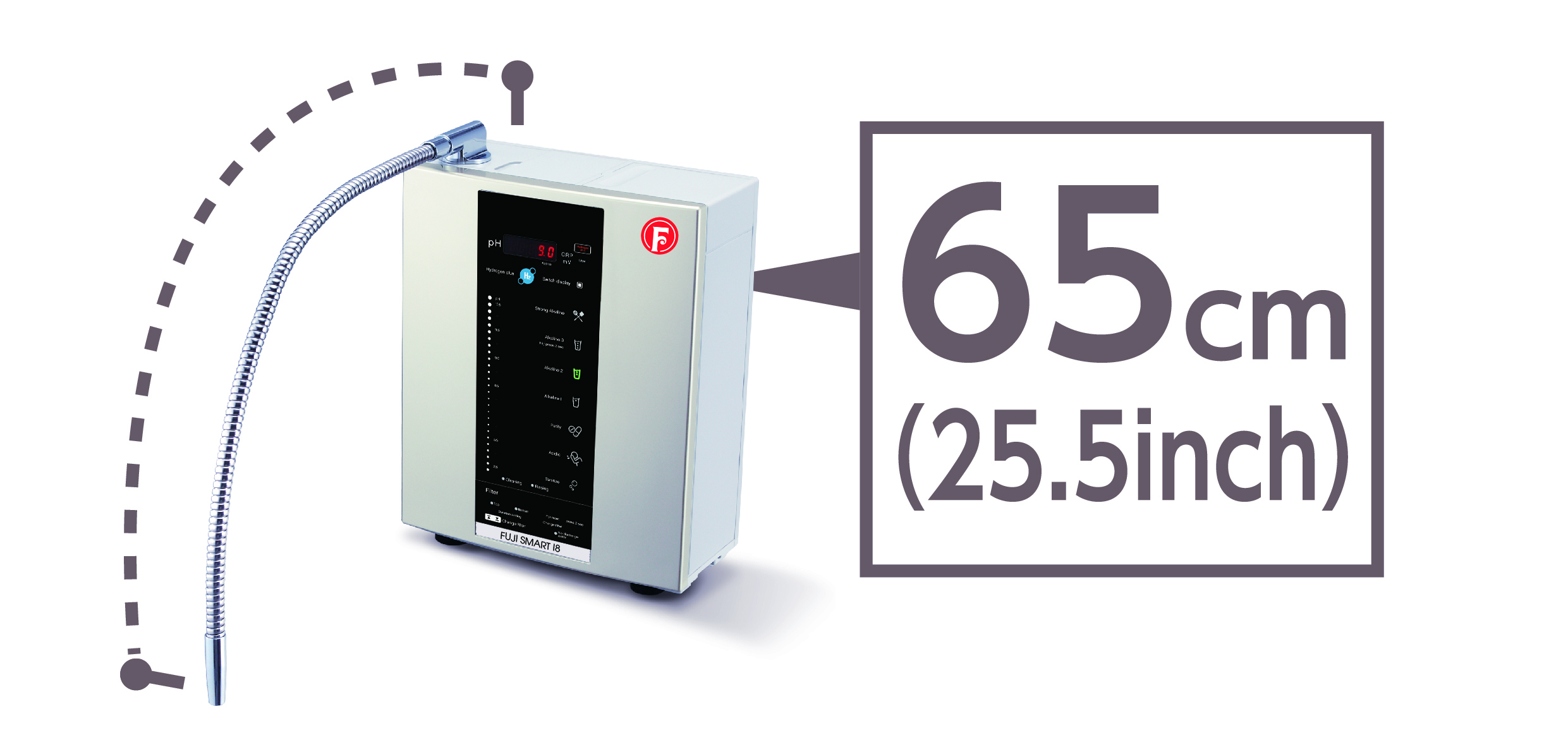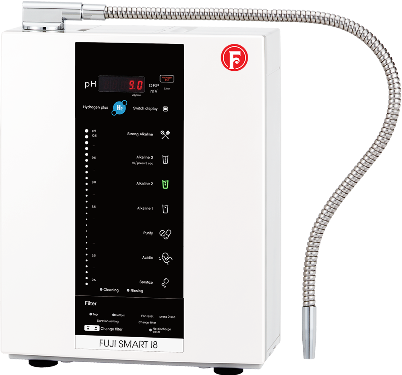 Với nút bấm cơ học dễ sử dụng ngay cả với người lớn tuổi, Fuji Smart I8 tạo ra 7 loại nước phục vụ nhiều mục đích sử dụng khác nhau, có khoảng pH từ 2.5 đến 10.5.
