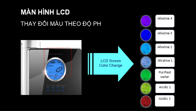 Chỉ cần 1 chạm nhẹ, bạn có thể chọn loại nước mình mong muốn. Màn hình của phiên bản K8 là màn hình LCD đa sắc màu hình tròn độc đáo. Đặc biệt màn hình có thể thay đổi màu sắc tương ứng với màu của 7 độ pH khác nhau – là một sáng tạo rất thông minh và chưa từng có nhà sản xuất nào có để giúp phân biệt rõ ràng các loại nước sử dụng. Vì chỉ cần nhìn màu sắc màn hình, bạn đã biết được đó là loại nước gì, độ pH là bao nhiêu mà không cần phải đọc chữ. Mọi thứ trở nên quá dễ dàng với công nghệ SMART.